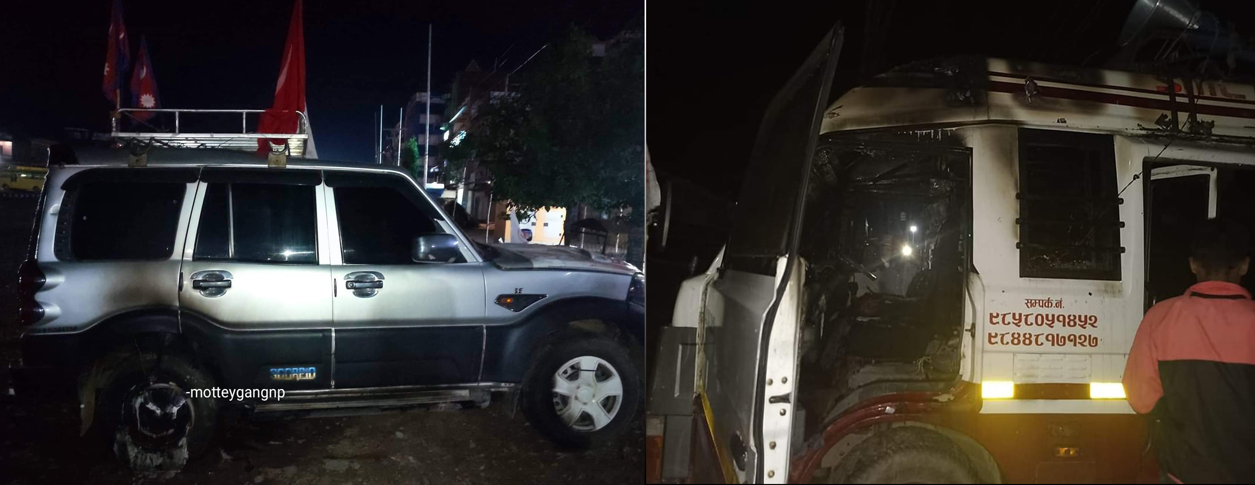 सत्कार होटल अगाडि रोकेर राखेको बा १४ च ६८३१ नम्बरको स्कर्पियो र सेन्चुरी बैंक अगाडि रोकेको कर्णाली प्रदेश ०२–००१ ख ००६१ नम्बरको मिनी बसमा आगजनी भएको हो।