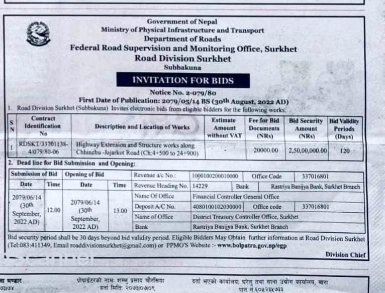 २०७९ भदौ १४ गते फोर लेन सडक निर्माणको लागि सडक विभागले निकालेको टेन्डरको सूचना
