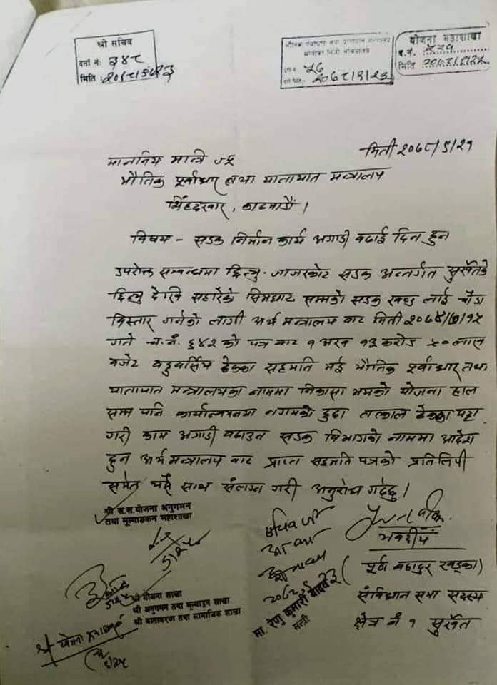 संविधानसभा सदस्यको हैसियतले नेता पूर्णबहादुर खड्काले २०७८ पुस २१ मा भौतिक पूर्वाधार तथा यातायात मन्त्रालयलाई सडक निर्माण सुरु गर्न लेखेको पत्र ।