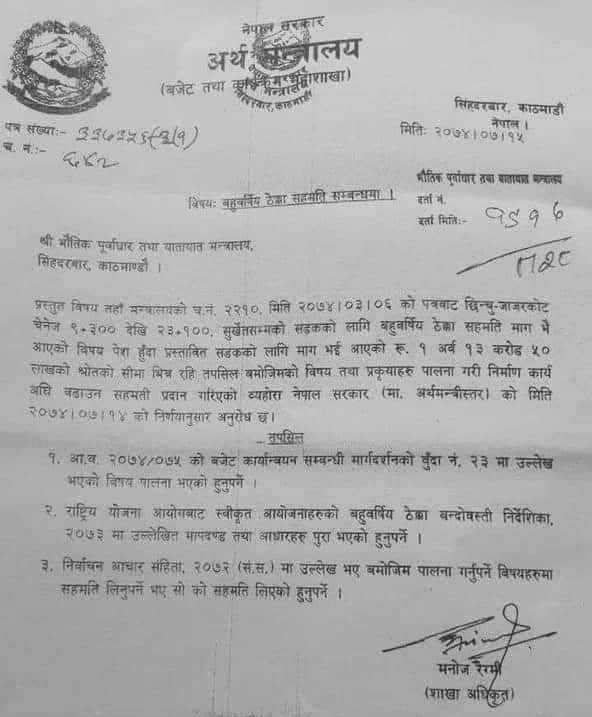 भौतिक पूर्वाधार तथा यातायात मन्त्रालयलले २०७८ पुस २५ गते सडक विभागलाई काम अघि बढाउने लेखेको पत्र ।