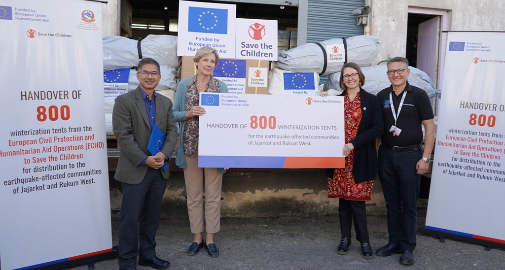 नेपालका लागि युरोपेली संघका राजदूत भेरोनिक लोरेन्जोले उक्त टेन्टहरु सेभ द चिल्ड्रेनलाई हस्तान्तरण गरेकी हुन्। २३ वर्गमिटर क्षेत्रफल ढाक्ने टेन्टहरु अग्नि प्रतिरोधक रहेको संस्थाले जनाएको छ। राष्ट्रिय विपद जोखिम न्युनिकरण तथा व्यवस्थापन प्राधिकरणसँगको समन्वयमा ती टेन्टहरु जाजरकोट र रुकुम पश्चिमका भूकम्प प्रभावितहरुलाई वितरण गरिनेछ।